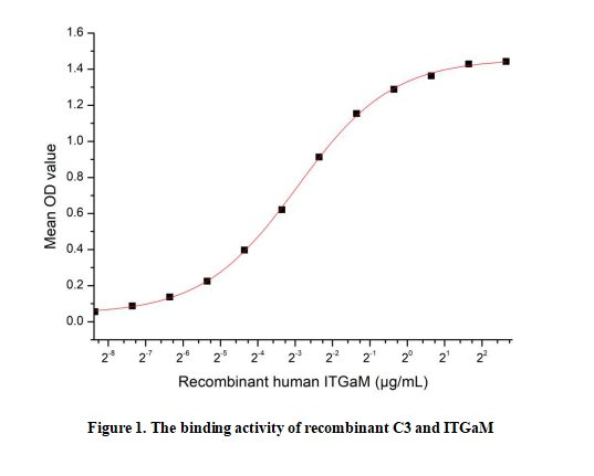 Integrin Alpha M (ITGaM, also known as CD11b) is a transmembrane subunit of the heterodimeric integrin receptor Mac-1 (CD11b/CD18), widely expressed on myeloid cells including macrophages, neutrophils, and dendritic cells. It mediates cell adhesion to extracellular matrix proteins (e.g., fibrinogen, ICAM-1) and regulates phagocytosis, inflammation, and immune cell recruitment, playing critical roles in host defense against pathogens and tissue repair. ITGaM binds to complement component C3 (especially its activated fragment C3b), facilitating opsonophagocytosis and amplifying innate immune responses.Briefly, C3 was diluted serially in PBS with 0.01% BSA (pH 7.4). Duplicate samples of 100 μl were then transferred to ITGaM-coated microtiter wells and incubated for 1h at 37℃. Wells were washed with PBST and incubated for 1h with anti-C3 pAb, then aspirated and washed 3 times. After incubation with HRP labelled secondary antibody for 1h at 37℃, wells were aspirated and washed 5 times. With the addition of substrate solution, wells were incubated 15-25 minutes at 37℃. Finally, add 50 μL stop solution to the wells and read at 450/630nm immediately.Measured by its binding ability in a functional ELISA. When Recombinant ITGaM is lmmobilized at 2 μg/mL(100 uLwell), the concentration of C3 that produces 50% optimal bindingresponse is found to be approximately 0.130 μg/mL.